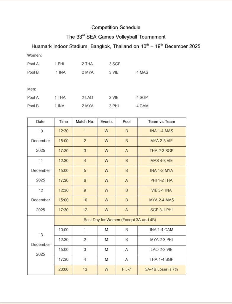 Voltaks.com – Cabang olahraga bola voli putra SEA Games 2025 akan berlangsung pada 13–19 Desember 2025 di Huamark Indoor Stadium, Bangkok. Berdasarkan jadwal resmi yang tercantum dalam dokumen pertandingan (foto Competition Schedule yang dirilis panitia), Tim Nasional Voli Putra Indonesia dipastikan tergabung dalam Pool B bersama Myanmar, Filipina, dan Kamboja.